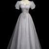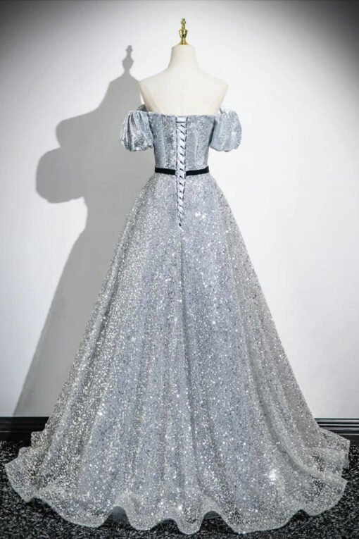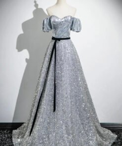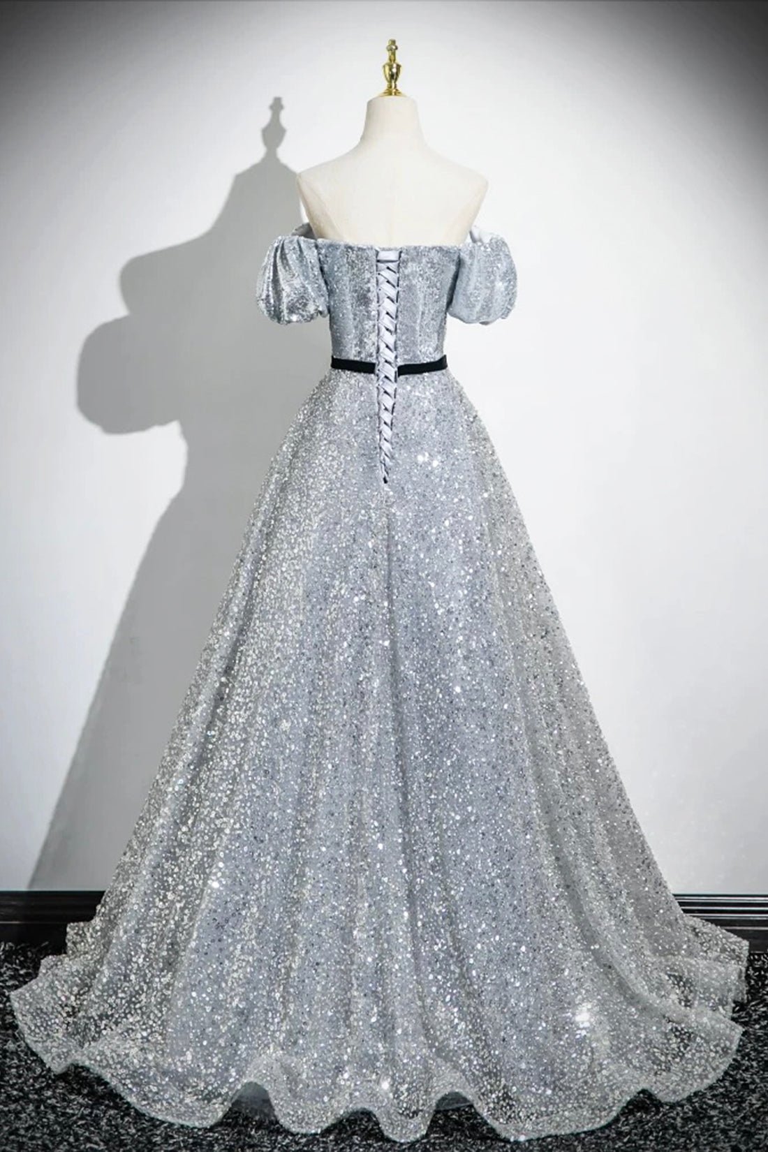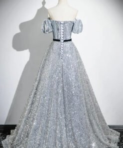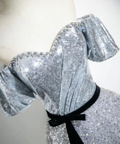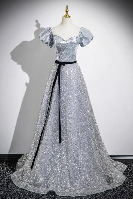 The Silver Sequins Floor Length Short Sleeve Prom Dress is a dazzling choice for any special event. Featuring cute short sleeves and intricate sequin detailing, it adds a touch of glamour to your evening look. With its flowing tulle skirt, this gown combines elegance and charm, making you the star of the night.